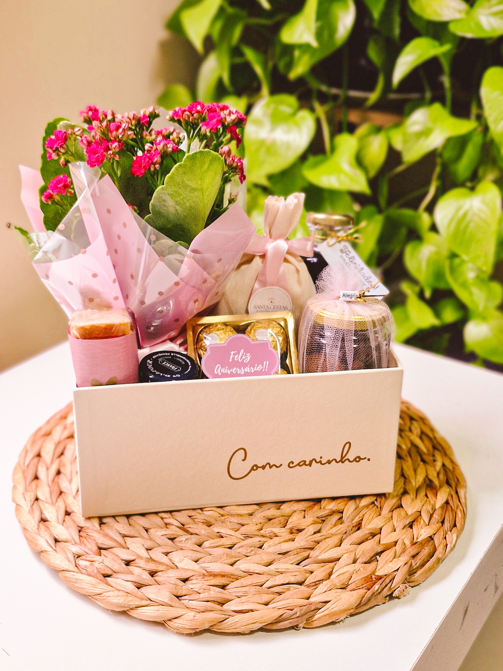Desfrute do encanto de um café da manhã ou chá da tarde com itens artesanais. A Cesta com carinho, além de itens selecionados, a cesta acompanha vaso de flores naturais.